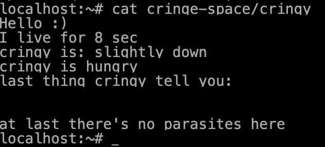 In order to answer Cringy needs, you must write stuff in it, so `echo "hug" > cringy-space/cringy` if you want to feed him.
